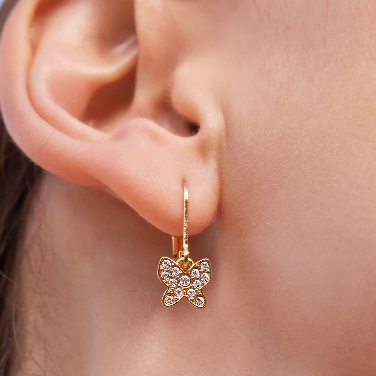 Baño de oro en tono bronce brillante de 24 quilates con finos cristales traslúcidos. Largo aprox. 2.3 cm. (Con pasador)