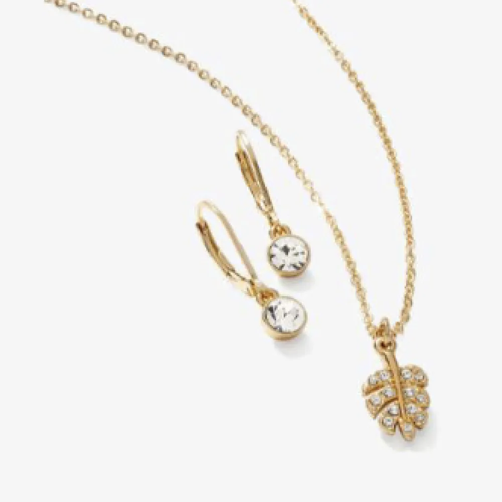 Baño de oro en tono bronce brillante de 24 quilates con finos cristales traslúcidos. Collar (largo aprox. 41 a 46 cm) y aretes (con pasador).