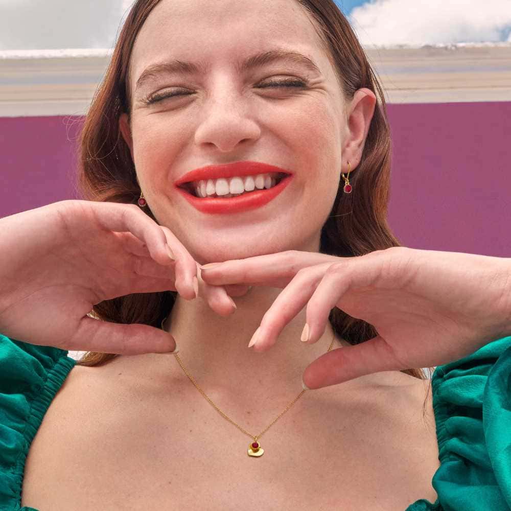 Baño de oro en tono clásico brillante de 24 quilates con finos cristales rojos. Collar (largo aprox. 41 a 46 cm.) y aretes (con pasador).