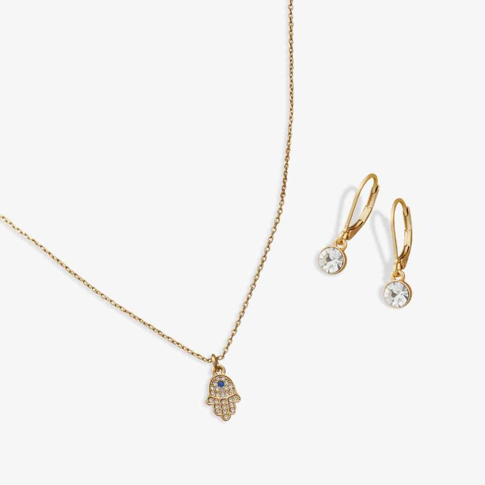 En baño de oro en tono bronce brillante de 24 quilates con finos cristales en traslúcido y azul. Collar de 41-46 cm. Aretes con pasador . *La mano de Fátima simboliza protección, amor y fidelidad*
