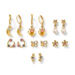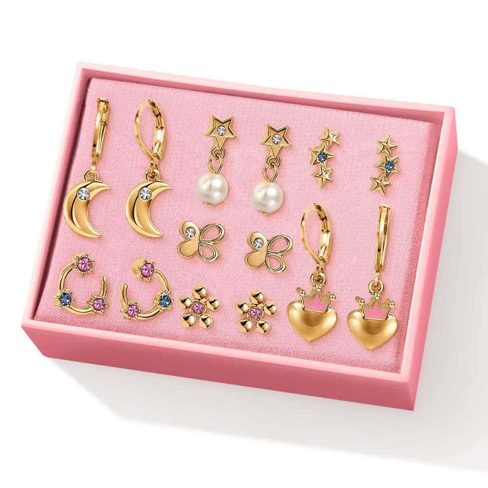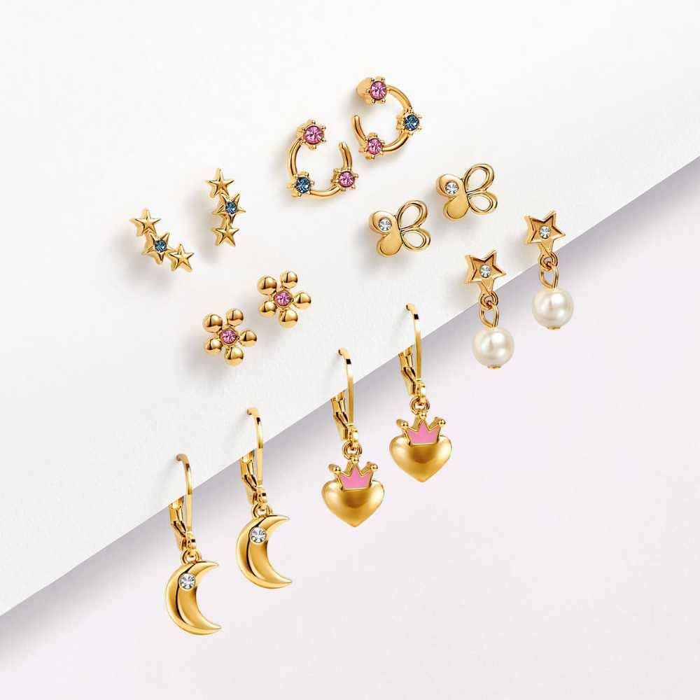Estuche de aretes para niñas x7 Lovely pieces. Esika . Con baño de oro de 24k. Con perlas y cristales. Pintado a mano . Arete más largo de 2.5 cm.