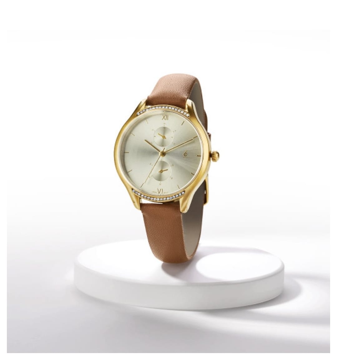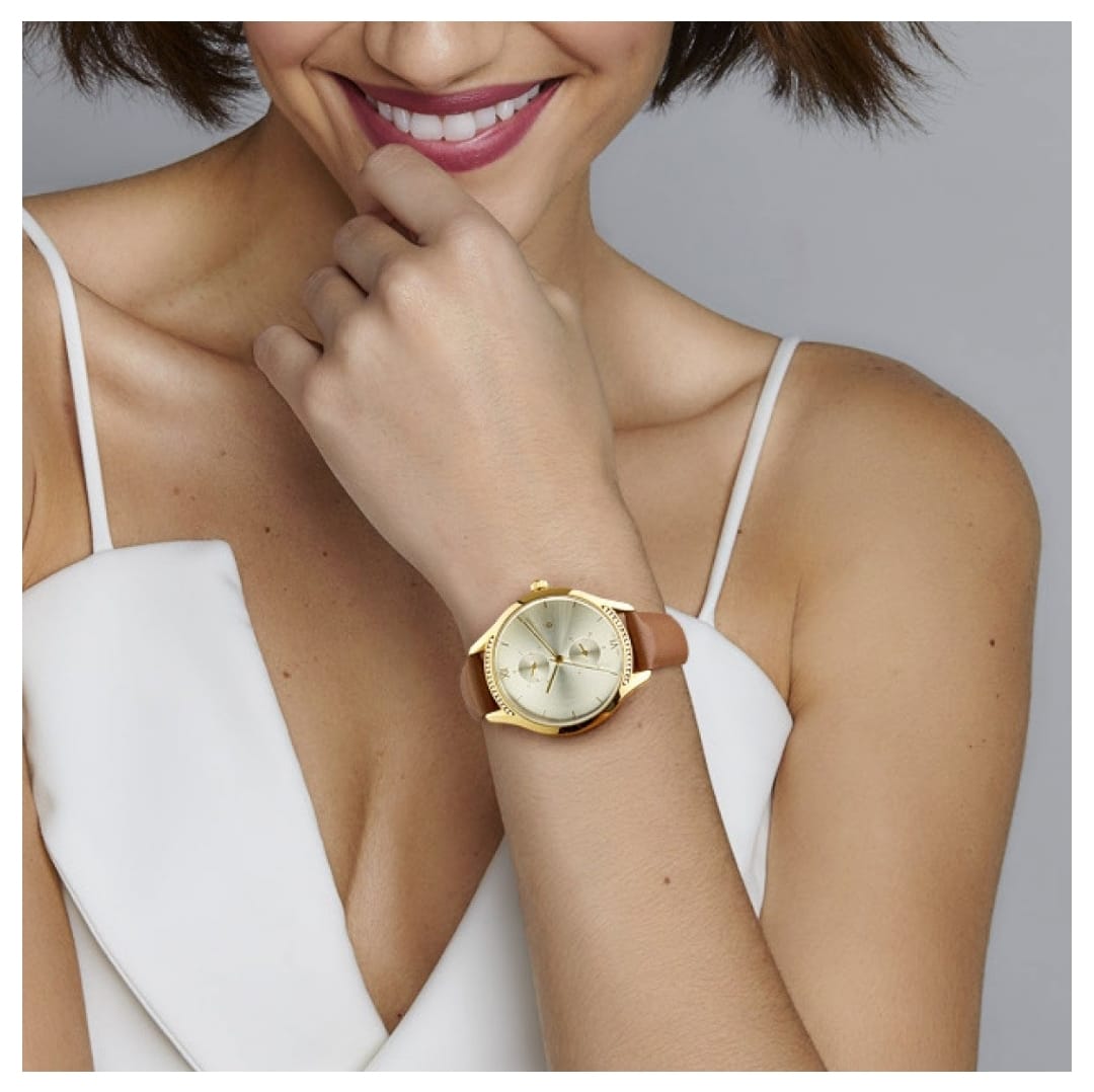 Caja de metal dorada de 3.6 cm. Incluye 36 cristales bisel (parte superior e inferior) de la caja. Dial incluye 2 cronógrafos decorativos. Correa de cuero genuino lisa color camel de 24 cm.