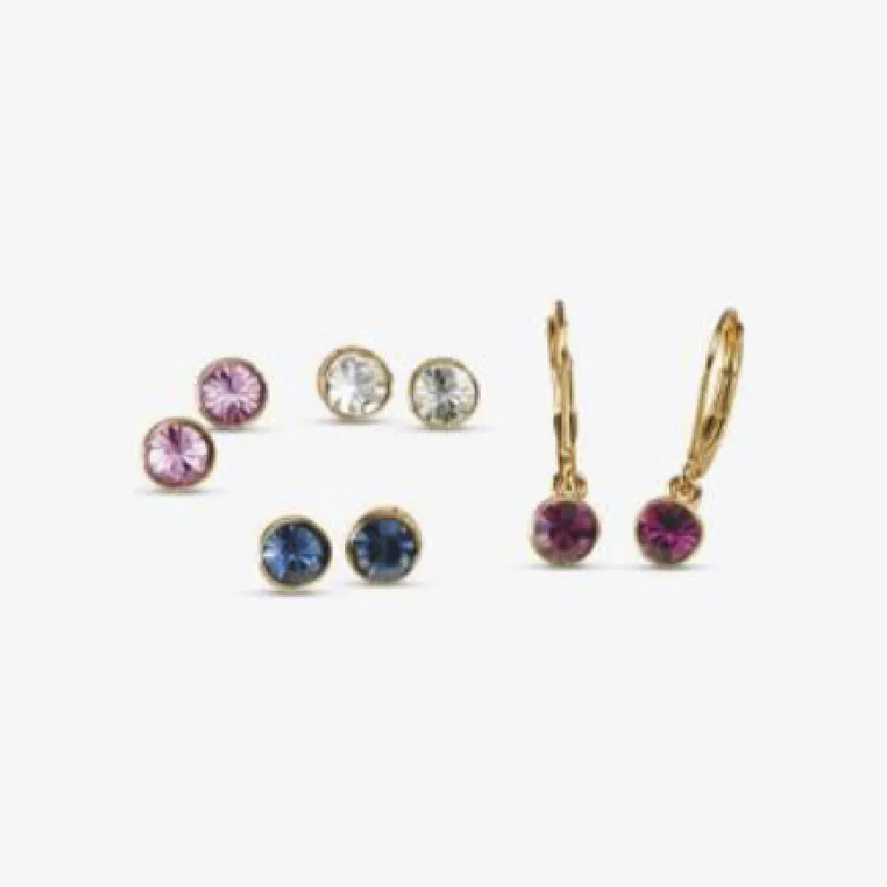 Baño de oro en tono bronce brillante de 24 quilates con finos cristales en lila, azul, traslúcido y morado. Set de 3 pares de aretes con poste y 1 con pasador.