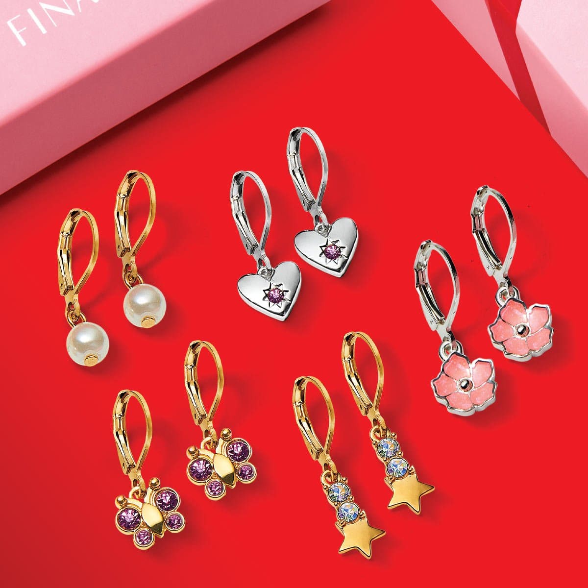Set de Aretes x5 de niñas en baño de oro de 24k y doble plata certificada, con cristales*, perlas Finart y pintado a mano.